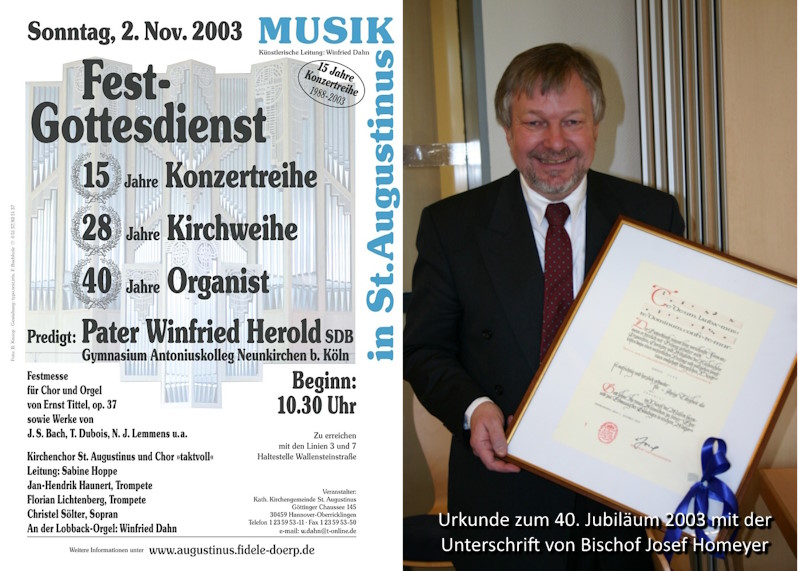 Die ehrenamtliche Leitung der Kirchenmusik beendete Winfried Dahn im Jahr 2022 nach 35 Jahren und ist als Senior Organist an St. Augustinus weiterhin aktiv.
